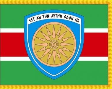 ΠΑΡΑΣΤΑΣΗ: Αρχαία μακεδονική ασπίδα, με τον ήλιο της Βεργίνας επί αυτής. Συμβολίζει την αποφασιστικότητα, τη δύναμη και τη θέληση της 1ης ΣΤΡΑΤΙΑΣ, να μην έλθει ποτέ σε συμβιβασμό με τους εχθρούς της.