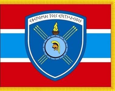 ΠΑΡΑΣΤΑΣΗ: Περικεφαλαία επί ασπίδας και ακόντια χιαστί και στο πάνω μέρος πυρσός, που συμβολίζει το πυρ το οποίο ο Προμηθέας έκλεψε από τον Όλυμπο και το παρέδωσε στους ανθρώπους. Τα ακόντια και η ασπίδα με την περικεφαλεία, συμβολίζουν τον οπλισμό και την εξάρτυση των αρχαίων Ελλήνων, δηλαδή την επιμελητεία, η οποία και αποτελεί τον πρόδρομο του ΣΥΠ.