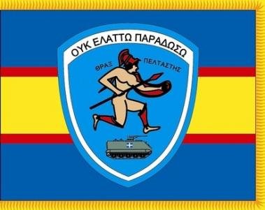ΠΑΡΑΣΤΑΣΗ: Θράκας πελταστής σε κίνηση και Τεθωρακισμένο Όχημα Μεταφοράς Προσωπικού (ΤΟΜΠ). Συμβολίζει, την περιοχή που είναι ταγμένη να υπερασπίσει η Ταξιαρχία και τη μηχανοκίνησή της.