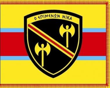 ΠΑΡΑΣΤΑΣΗ: Δύο αμφίστομοι πελέκεις. Για τους αρχαίους Έλληνες είχε θρησκευτική σημασία, είτε ως σύμβολο του κεραυνού και του θεού που τον εκσφενδονίζει, είτε ως αντικείμενο αφιερώματος. Ιδιαίτερα στην Κρήτη, ο διπλός πέλεκυς ή “Λάβρος” είχε σπουδαία θρησκευτική σημασία, φαίνεται δε ότι σχετιζόταν με τον κεραυνό ή τη θυσία του ιερού ταύρου. Για τη Μεραρχία οι πελέκεις συμβολίζουν τα όπλα, “κεραυνούς” της, κατά των εχθρών.