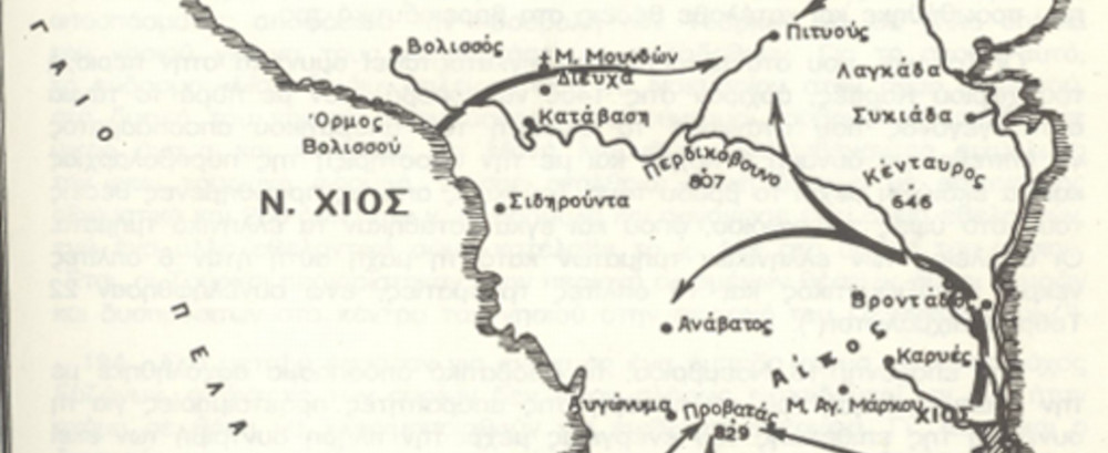 After the denial of the Turkish commander, the landing of Greek forces began south of the town of Chios. Having organised defences in the port, the Turks resisted strongly until the evening hours, despite the effective fire of the Hellenic fleet and the threat of landing sections, and were, consequently, forced to abandon their positions and regroup Northwest of Chios, in the mountain region of Karyes village.