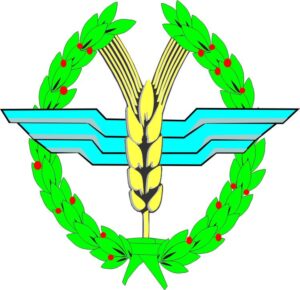 The insignia of the Supply and Transport Corps consists of a round-shaped laurel envelope which surrounds a wheatear and two wings.