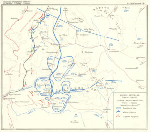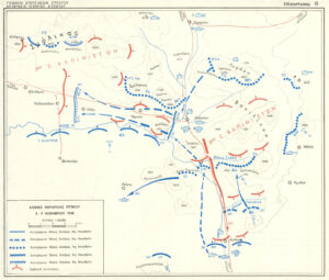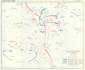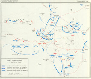 Σχεδιάγραμμα στο οποίο αναφαίνεται η επιθετική κίνηση των Μεραρχίας και Ταξιαρχίας Ιππικού τον Νοέμβριο 1940 προς κατάληψη των χωριών Δίστρατο, Βωβούσα, Σαμαρίνα, Κόνιτσα (Αρχείο ΓΕΣ/ΔΙΣ, Φ.715/Α/6).