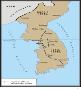 Σχεδιάγραμμα 1: Γεωγραφική Θέση Κορέας – Χώρες του ΟΗΕ που διέθεσαν δυνάμεις