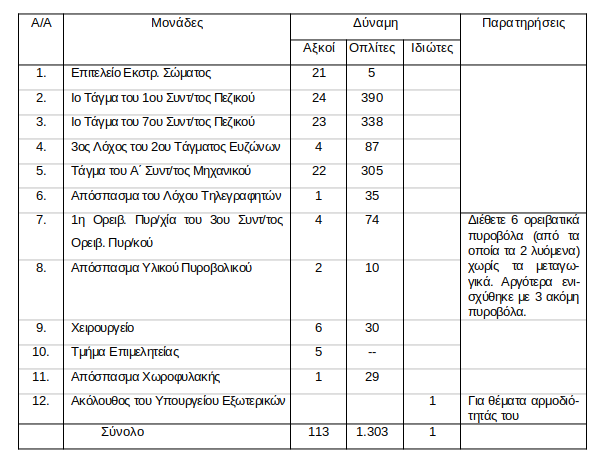 5 Φεβρουαρίου, στον Πλατανιά, μικτό απόσπασμα υπό τις διαταγές του Ταγματάρχη Πεζικού Κωνσταντινίδη Ιωάννη, το οποίο αποτελούνταν από :