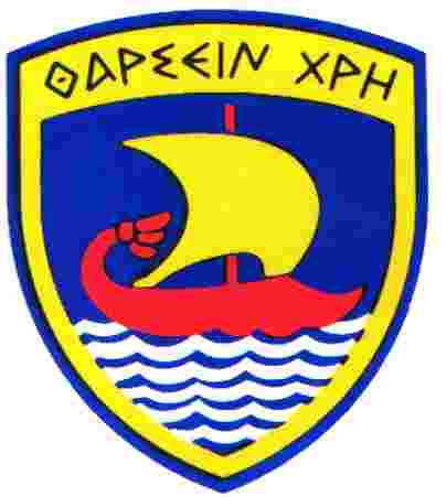 Είναι σχήματος μεσαιωνικής ασπίδας μπλε χρώματος και η παράσταση πάνω σε αυτό συμβολίζει το αρχαίο πλοίο “ΑΡΓΩ”, το οποίο χρησιμοποιήθηκε από τον μυθικό ηρώα Ιάσονα, γιο του βασιλιά της Ιωλκού Αίσονα, κατά την Αργοναυτική Εκστρατεία του στη Μαύρη Θάλασσα για την αρπαγή του “χρυσόμαλλου δέρατος” από τη μυθική Κολχίδα. Η επιχείρηση αυτή θεωρείται ως η πρώτη αμφίβια στην Ελληνική Μυθολογία. Οι δύο λέξεις στην κορυφή του εμβλήματος “ΘΑΡΣΕΙΝ ΧΡΗ”, αποτελεί τμήμα της φράσης “Θαρσείν χρή ταχ’ αύριον έσετ΄ άμεινον”, που σημαίνει “Πρέπει να έχετε θάρρος ίσως αύριο να είναι καλύτερα”, τη φράση αυτή είπε η θεά Αθηνά, δια του στόματος του πολυμήχανου Οδυσσέα, στους Έλληνες που πολιορκούσαν την Τροία, όταν αυτοί ήταν έτοιμοι να εγκαταλείψουν την προσπάθειά τους, με αποτέλεσμα να εμψυχωθούν και να την καταλάβουν με την καταδρομική επιχείρηση “ΔΟΥΡΕΙΟΣ ΙΠΠΟΣ”