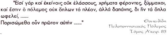 Η φράση μεταφράζεται στη Νεοελληνική ως εξής: «Διότι και εκείνοι (οι Αθηναίοι) δεν έχουν λιγότερους συμμάχους, οι οποίοι έχουν χρήματα, και διεξάγεται ο πόλεμος όχι τόσο με τα όπλα, αλλά με τα χρήματα (τη δαπάνη), με τα οποία τα όπλα γίνονται χρήσιμα…
