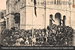 Η διακήρυξη της Ένωσης με την Ελλάδα στο προαύλιο του Αγίου Σπυρίδωνα μετά την αποχώρηση του Τουρκικού Στρατού